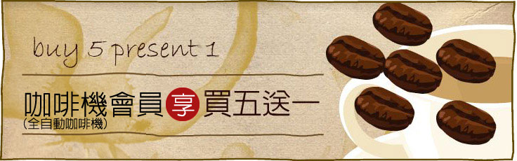在本站購買全自動咖啡機之顧客,享有咖啡豆有★註記買咖啡機買五送一之終身優惠,而且就購買『買五送一』的部份,仍然享有VIP會員折扣及滿額贈之雙重優惠。